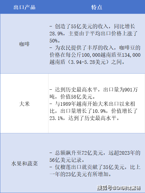 台风摩羯对2024年越南经济发生了严沉影响,了越南北部地域的社会经济勾当,结合国开辟打算署(UNDP)的最新研究演讲了此次台风形成的财务和经济丧失。虽然遭到台风的影响,越南经济正在2024年仍连结强劲增加。沉建和恢复工做鞭策了建建材料、零售和物流等行业的需求添加,为这些部分带来了新的机缘。2024年,合适方针。12月份,CPI同比上涨0。29%,次要受医疗办事、租赁住房和燃料价钱上涨鞭策。不包罗食物和能源等波动较大项目标焦点通缩率正在2024年上涨了2。71%,2024年,越南的商业总额达到7862。9亿美元,同比增加15。4%,创下了247。7亿美元的商业顺差新高。2024年,越南的出口表示显著苏醒,37个沉点出口项目均跨越10亿美元,占总出口额的94。3%。此中8个品种的出口额跨越100亿美元,占总出口额的69%。这一增加标记着从2023年的4。6%下降中大幅反弹。越南的月平均出口额约为300亿美元,超越了中国、韩国、泰国和印度尼西亚等地域同业,这些国度同期的出口增加率正在1。33%到12。7%之间。农业部分是越南出口增加的环节鞭策力。虽然面对天然灾祸、风行病和全球市场波动等挑和,2024年农林渔业出口仍达到624亿美元,同比增加18。5%。